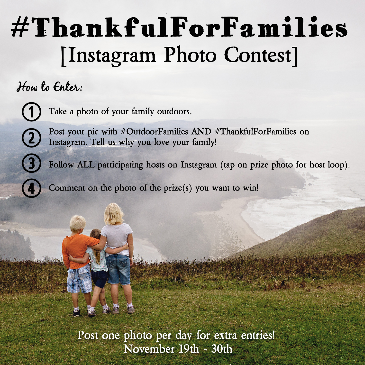 Post a NEW photo of your outdoor family on Instagram making sure to include both #ThankfulForFamilies AND #OutdoorFamilies and tell us why you love your family!
